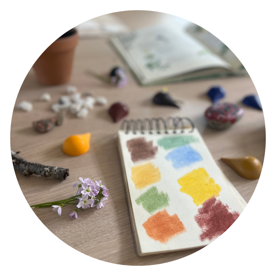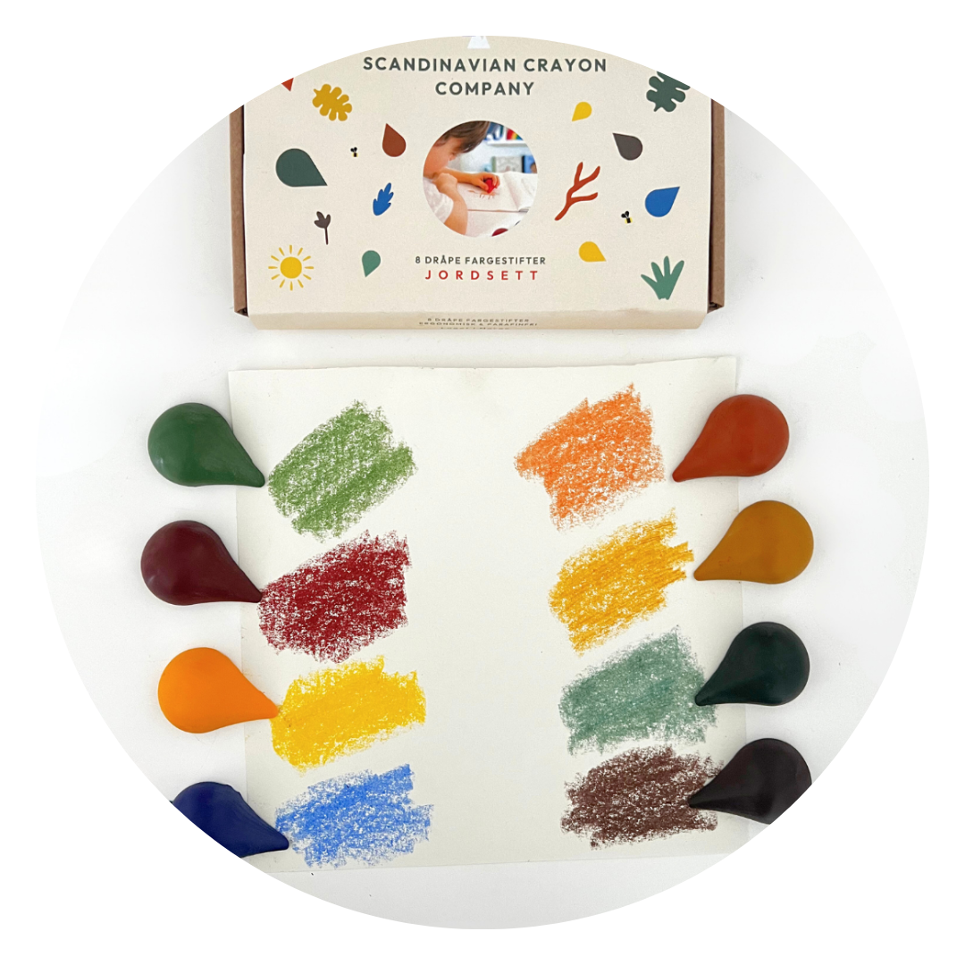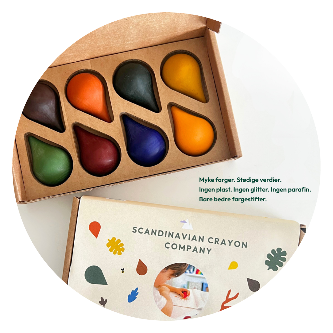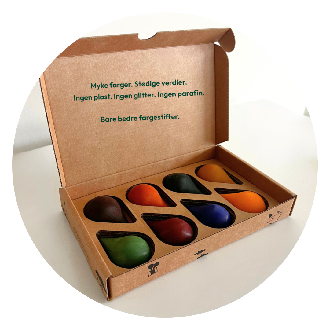 De fleste av fargestiftene våre (11 av 15 farger) bruker mineralbaserte pigmenter. Fire farger—Gul, Rød, Fuchsia og Lilla—inneholder for øyeblikket syntetiske organiske pigmenter (azo- eller quinacridon-baserte). Vi forsker aktivt på naturlige alternativer for disse nyansene, med nye formuleringer for Rød og Gul forventet i 2026. Alle fargestifter oppfyller EN 71 sikkerhetsstandarder for barns kunstmateriell.