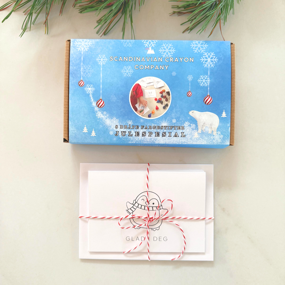 Vårt populære julesett kombinerer Dråpe fargestifter i festlige julefarger med unike julekort som kan farges inn og beholdes som kjære minner. Lage personlige, håndlagde julekort til familie og venner